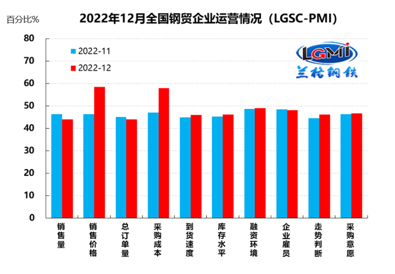 蘭格鋼鐵網(wǎng)統(tǒng)計(jì)發(fā)布的2022年12月份鋼鐵流通業(yè)PMI總指數(shù)為 47.2%,比上月回落0.7個(gè)百分點(diǎn),在收縮區(qū)間內(nèi)略有下滑。從分類指數(shù)看,構(gòu)成鋼鐵流通業(yè) PMI